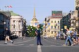 Генеральная репетиция парада, посвященного Дню Военно-морского флота (ВМФ) России в акватории реки Невы. Жанровая фотография . Сотрудник ДПС на перекрытом Невском проспекте.