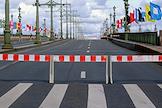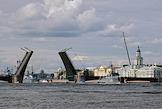Генеральная репетиция парада, посвященного Дню Военно-морского флота (ВМФ) России в акватории реки Невы. Жанровая фотография . Перекрытие Троицкого моста перед началом подъема для прохода кораблей по Неве.