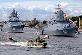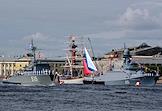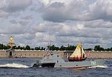 Генеральная репетиция парада, посвященного Дню Военно-морского флота (ВМФ) России в акватории реки Невы. Корабли и суда на марше.