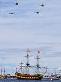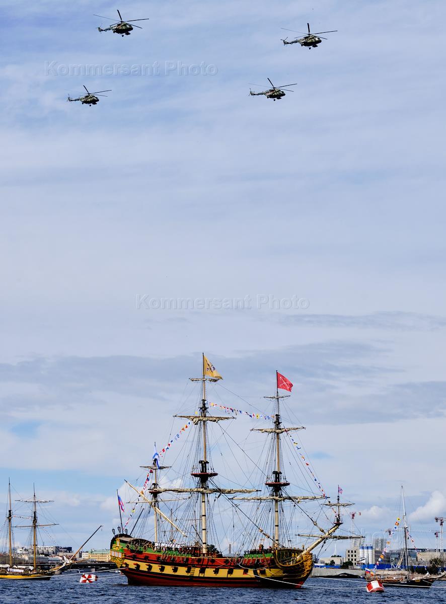 Генеральная репетиция парада, посвященного Дню Военно-морского флота (ВМФ) России в акватории реки Невы. Вертолетная группа в небе над кораблями.