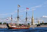 Генеральная репетиция парада, посвященного Дню Военно-морского флота (ВМФ) России в акватории реки Невы. Жанровая фотография. Линейный корабль "Полтава" на фоне Петропавловской крепости.