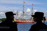 Генеральная репетиция парада, посвященного Дню Военно-морского флота (ВМФ) России в акватории реки Невы. Жанровая фотография. Сотрудники полиции и линейный корабль "Полтава" на фоне Петропавловской крепости.
