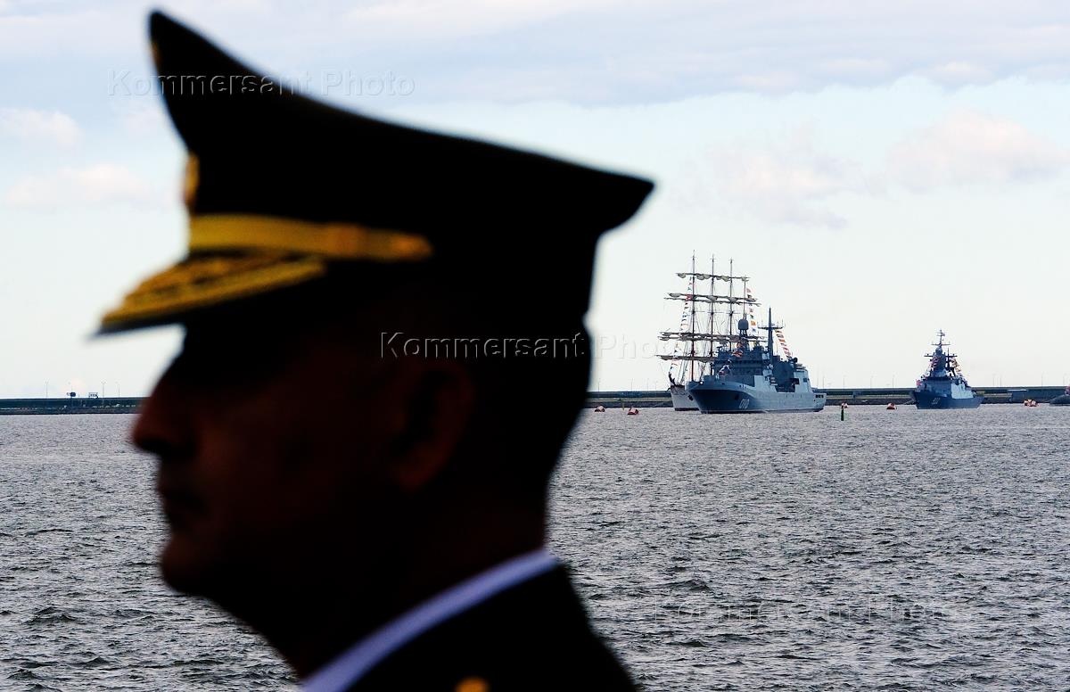 Главный военно-морской парад в честь Дня Военно-морского флота (ВМФ) России в Кронштадте. Жанровая фотография. Корвет "Стойкий" (слева) на параде.