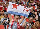 Российская Премьер-Лига (РПЛ). МИР - Чемпионат России по футболу 2022/2023. 3 тур. Матч между командами "Спартак" (Москва) - "Оренбург" (Оренбург) на стадионе "Открытие Арена". Болельщики команды "Спартак" с флагом ВМФ России на трибуне стадиона.