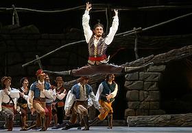 Гастроли Красноярского государственного театра оперы и балета имени Д.А. Хворостовского, приуроченные к 60-летию со дня рождения Дмитрия Хворостовского, на сцене Государственного Академического Большого театра (ГАБТ). Московская премьера балета Цезаря Пуни "Катарина, или Дочь разбойника". Ведущий солист Марчелло Пелиццони во время спектакля.