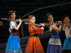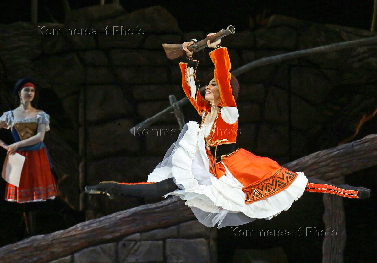 Гастроли Красноярского государственного театра оперы и балета имени Д.А. Хворостовского, приуроченные к 60-летию со дня рождения Дмитрия Хворостовского, на сцене Государственного Академического Большого театра (ГАБТ). Московская премьера балета Цезаря Пуни "Катарина, или Дочь разбойника". Ведущая солистка Наталья Боброва (вторая слева) во время спектакля.