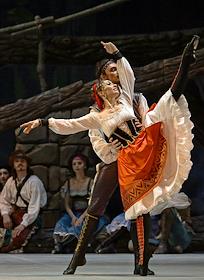 Гастроли Красноярского государственного театра оперы и балета имени Д.А. Хворостовского, приуроченные к 60-летию со дня рождения Дмитрия Хворостовского, на сцене Государственного Академического Большого театра (ГАБТ). Московская премьера балета Цезаря Пуни "Катарина, или Дочь разбойника". Ведущие солисты Марчелло Пелиццони и Наталья Боброва во время спектакля.