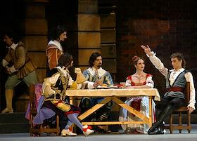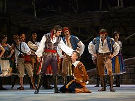 Гастроли Красноярского государственного театра оперы и балета имени Д.А. Хворостовского, приуроченные к 60-летию со дня рождения Дмитрия Хворостовского, на сцене Государственного Академического Большого театра (ГАБТ). Московская премьера балета Цезаря Пуни "Катарина, или Дочь разбойника". Ведущий солист Марчелло Пелиццони (второй справа) во время спектакля.