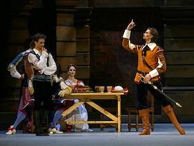Гастроли Красноярского государственного театра оперы и балета имени Д.А. Хворостовского, приуроченные к 60-летию со дня рождения Дмитрия Хворостовского, на сцене Государственного Академического Большого театра (ГАБТ). Московская премьера балета Цезаря Пуни "Катарина, или Дочь разбойника". Ведущие солисты Матвей Никишаев (слева), Анна Саленкова (в центре) и Егор Осокин (справа) во время спектакля.