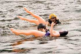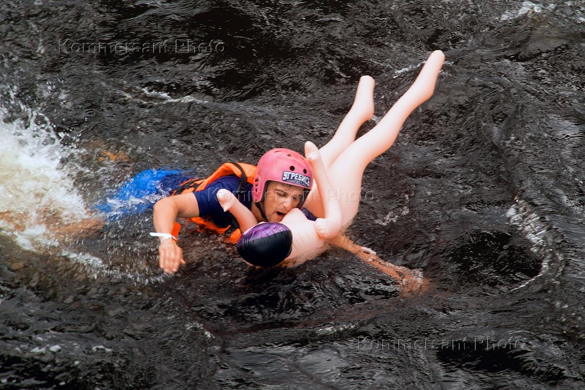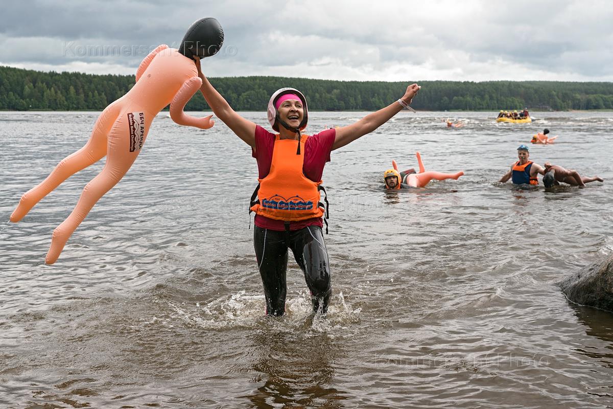 Заплыв "Bubble Baba Challenge – 2022" по Лосевскому порогу на надувных резиновых женщинах. Участники во время заплыва.