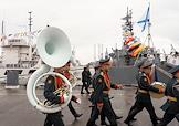Главный военно-морской парад в честь Дня Военно-морского флота (ВМФ) России в Кронштадте. Музыканты военного оркестра во время парада.
