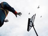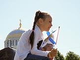 Празднование Дня Военно-морского флота (ВМФ) России в Кронштадте. Жанровая фотография. Мальчик с Андреевским флагом на улице.