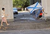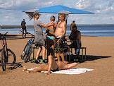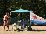 Празднование Дня Военно-морского флота (ВМФ) России в Кронштадте. Жанровая фотография. Отдыхающие на пляже с флагом ВМФ.