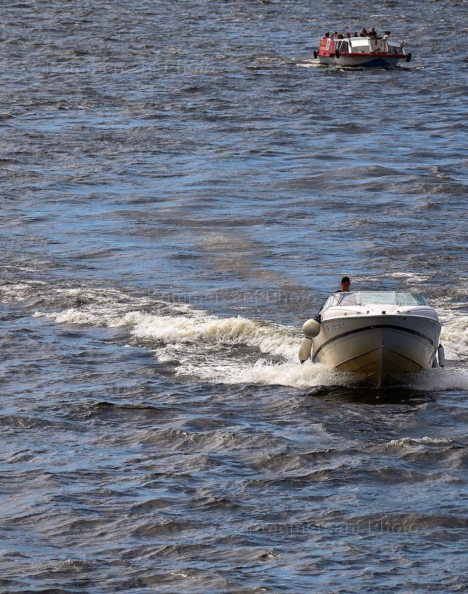 Главный военно-морской парад в честь Дня Военно-морского флота (ВМФ) России в акватории реки Невы. Катера со зрителями во время парада.