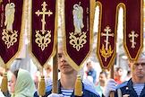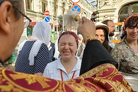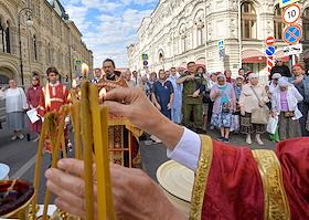Праздничные мероприятия, посвященные 92-й годовщине создания Воздушно-десантных войск (ВДВ) России, на Красной площади. День ВДВ России отмечают 2 августа в день памяти пророка Илии, небесного покровителя Воздушно-десантных войск. Жанровая фотография. Участники Крестного хода из храма Пророка Божия Илии в Китай-городе до Лобного места на Красной площади.