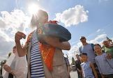 Праздничные мероприятия, посвященные 92-й годовщине создания Воздушно-десантных войск (ВДВ) России, на Красной площади у православного креста. День ВДВ России отмечают 2 августа в день памяти пророка Илии, небесного покровителя Воздушно-десантных войск. Жанровая фотография. Бывший десантник с детьми на Красной площади.