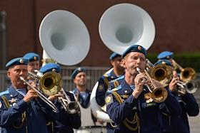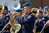 Праздничные мероприятия, посвященные 92-й годовщине создания Воздушно-десантных войск (ВДВ) России, на Красной площади. День ВДВ России отмечают 2 августа в день памяти пророка Илии, небесного покровителя Воздушно-десантных войск. Музыканты военного оркестра ВДВ России во время мероприятий.