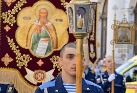 Праздничные мероприятия, посвященные 92-й годовщине создания Воздушно-десантных войск (ВДВ) России, на Красной площади. День ВДВ России отмечают 2 августа в день памяти пророка Илии, небесного покровителя Воздушно-десантных войск. Жанровая фотография. Участник Крестного хода из храма Пророка Божия Илии в Китай-городе до Лобного места на Красной площади с иконой святого Илии.
