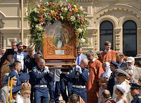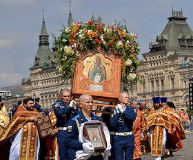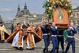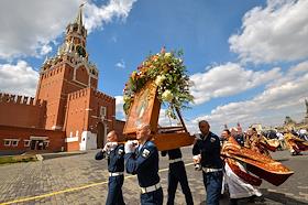 Праздничные мероприятия, посвященные 92-й годовщине создания Воздушно-десантных войск (ВДВ) России, на Красной площади. День ВДВ России отмечают 2 августа в день памяти пророка Илии, небесного покровителя Воздушно-десантных войск. Жанровая фотография. Участники Крестного хода из храма Пророка Божия Илии в Китай-городе до Лобного места на Красной площади с иконой святого Илии.