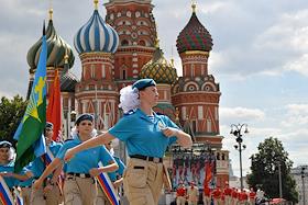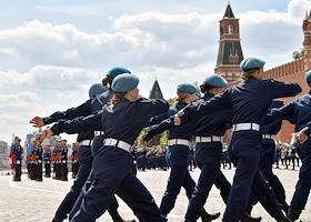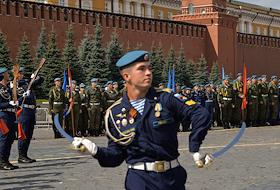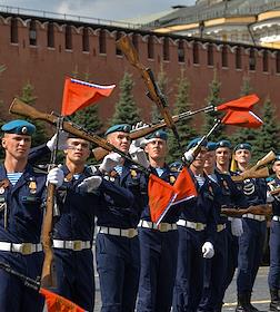 Праздничные мероприятия, посвященные 92-й годовщине создания Воздушно-десантных войск (ВДВ) России, на Красной площади. День ВДВ России отмечают 2 августа в день памяти пророка Илии, небесного покровителя Воздушно-десантных войск. Торжественный марш военнослужащих ВДВ России.
