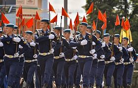 Праздничные мероприятия, посвященные 92-й годовщине создания Воздушно-десантных войск (ВДВ) России, на Красной площади. День ВДВ России отмечают 2 августа в день памяти пророка Илии, небесного покровителя Воздушно-десантных войск. Жанровая фотография. Учащиеся кадетского корпуса во время показательных выступлений.