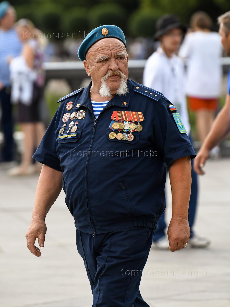 Праздничные мероприятия, посвященные 92-й годовщине создания Воздушно-десантных войск (ВДВ) России в Парке Горького. Бывшие десантники во время мероприятий в парке.