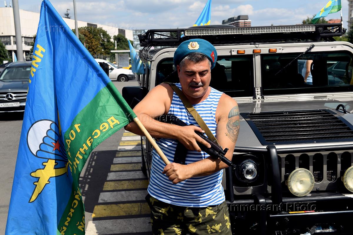 Праздничные мероприятия, посвященные 92-й годовщине создания Воздушно-десантных войск (ВДВ) России в Парке Горького. Бывшие десантники едут по улице на автомобиле с надписью на стекле "Десантура" по улице города.