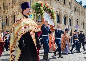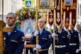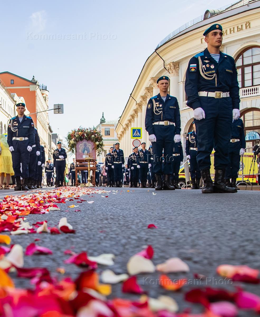 Праздничные мероприятия, посвященные 92-й годовщине создания Воздушно-десантных войск (ВДВ) России, на Красной площади. День ВДВ России отмечают 2 августа в день памяти пророка Илии, небесного покровителя Воздушно-десантных войск. Жанровая фотография. Участники Крестного хода из храма Пророка Божия Илии в Китай-городе до Лобного места на Красной площади.