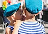 Праздничные мероприятия, посвященные 92-й годовщине создания Воздушно-десантных войск (ВДВ) России, на Красной площади. День ВДВ России отмечают 2 августа в день памяти пророка Илии, небесного покровителя Воздушно-десантных войск. Жанровая фотография. Дети в тельняшках и беретах во время мероприятий.