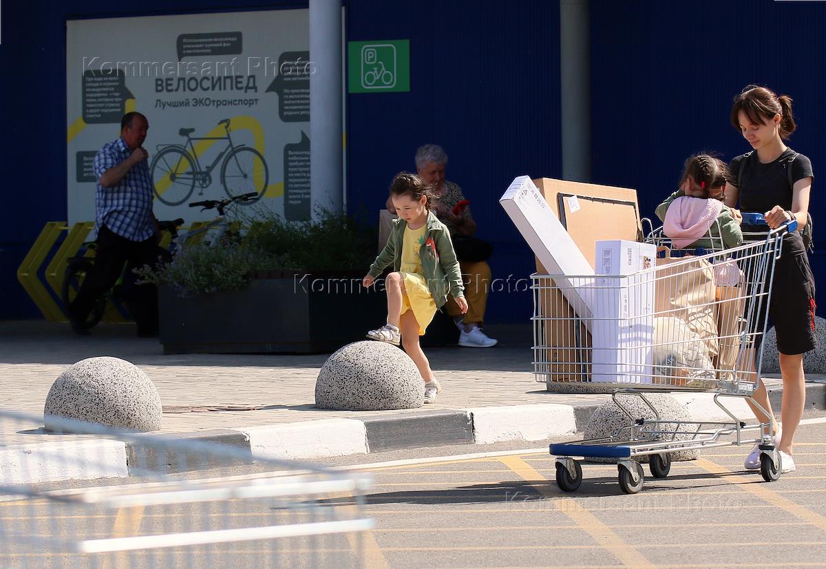 Работа пункта выдачи магазина "ИКЕА" в торговом центра "Мега". Жанровая фотография. Люди с товарами на выходе из пункта.