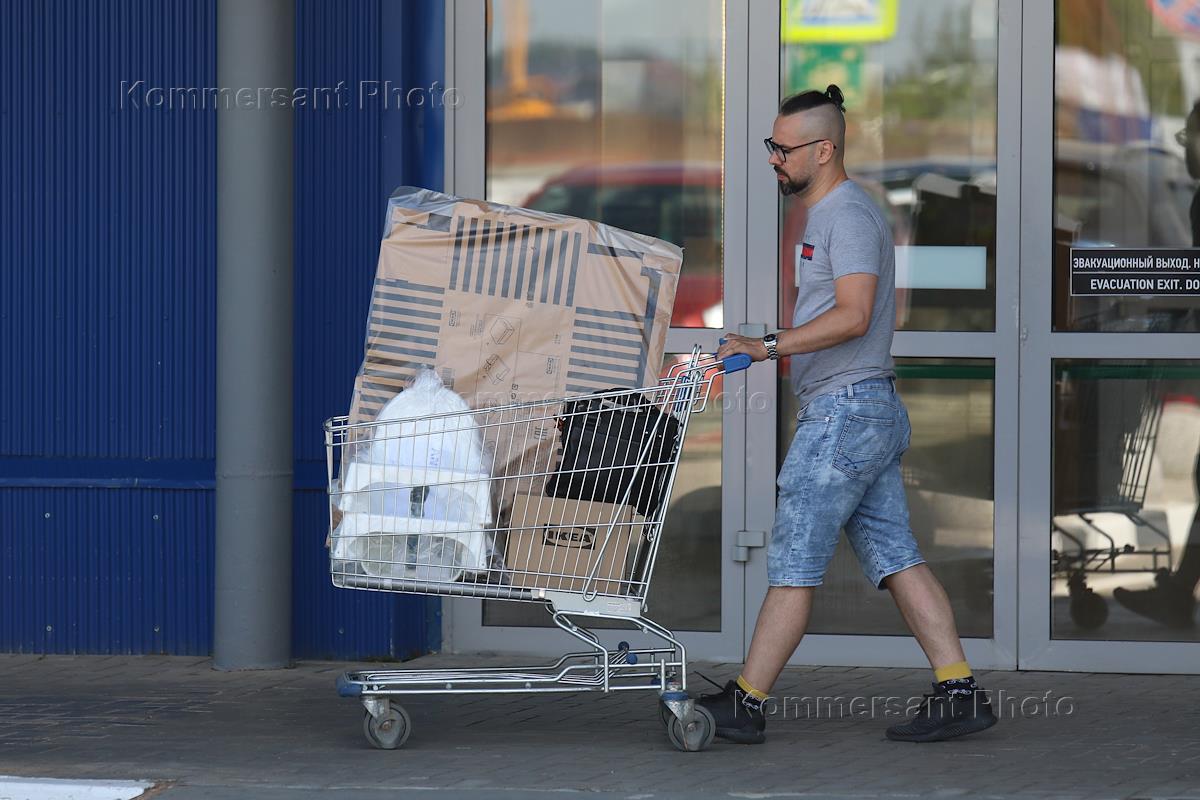 The work of the pick-up point of the store "IKEA" in the shopping center "Mega". Genre photography. People with goods at the exit of the point.
