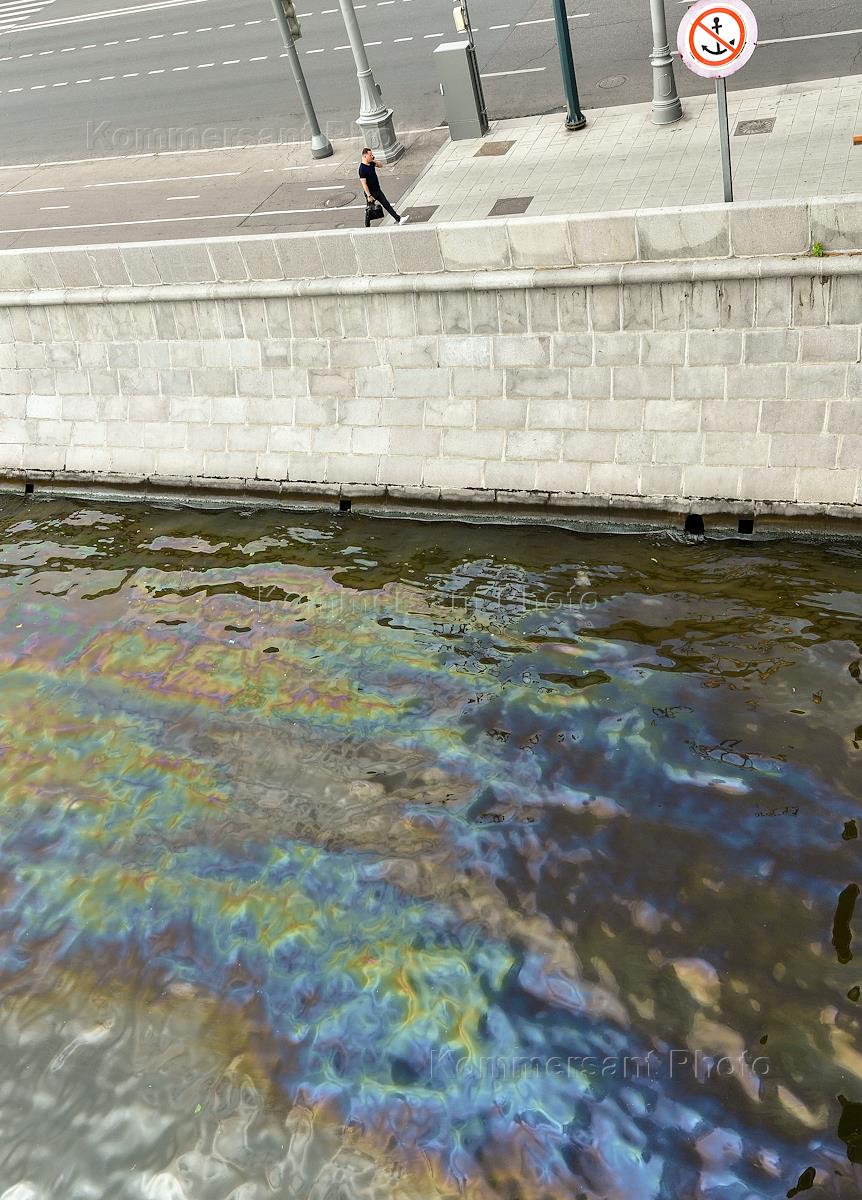 Пятно от нефтепродуктов площадью порядка 4,5 тысячи квадратного метра на поверхности Москве-реки в районе Крымского моста.