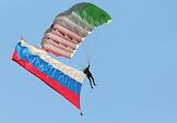 Авиационный праздник "Я выбираю небо", посвященный Дню Воздушного флота России. Выступление парашютиста с Российским Флагом.