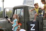 Авиационный праздник "Я выбираю небо", посвященный Дню Воздушного флота России. Жанровая фотография, Дети сидят на военном грузовике с буквой Z на борту.