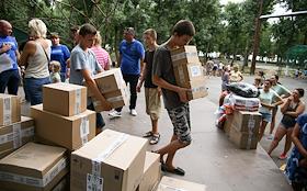 Национальный центр помощи пропавшим и пострадавшим детям передаст вынужденным переселенцам Донбасса, находящимся в пунктах временного размещения (ПВР) в Неклиновском районе Ростовской области, предметы первой необходимости. Жанровая фотография. Волонтеры Национального центра помощи пропавшим и пострадавшим детям и сотрудники МЧС России в ПВР "Ромашка" в поселке Золотая Коса.