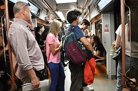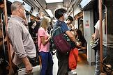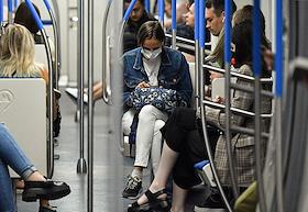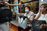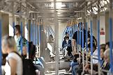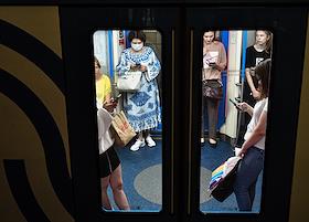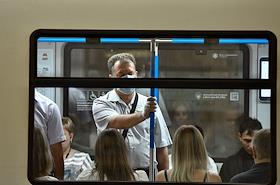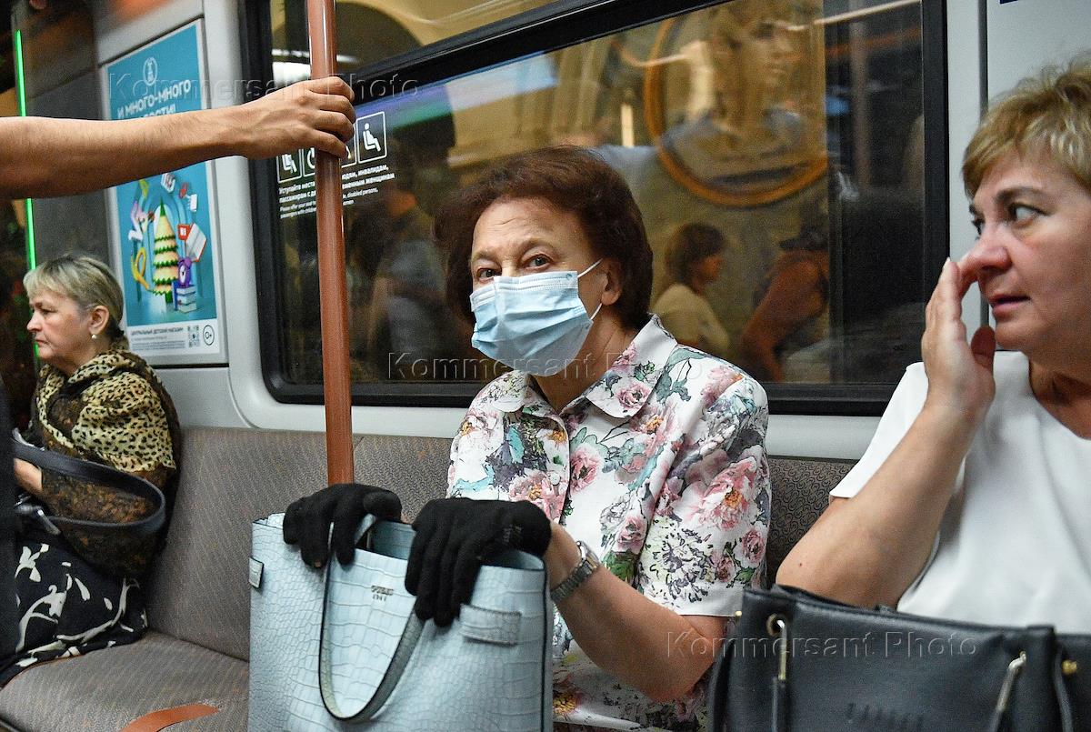 Виды Москвы в период подъема заболеваемости коронавирусной инфекцией. Жанровая фотография. Ситуация в московском метрополитене. Пассажиры в медицинских масках в вагоне поезда.