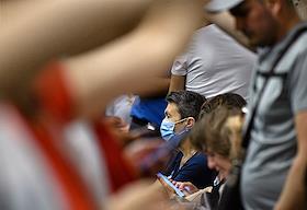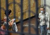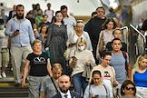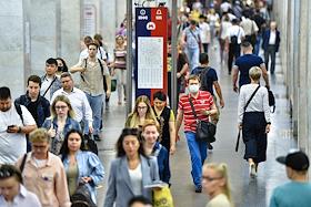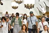 Виды Москвы в период подъема заболеваемости коронавирусной инфекцией. Жанровая фотография. Ситуация в московском метрополитене. Пассажиры на станции "Комсомольская" Сокольнической линии метро.