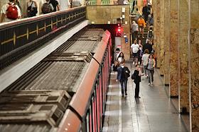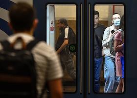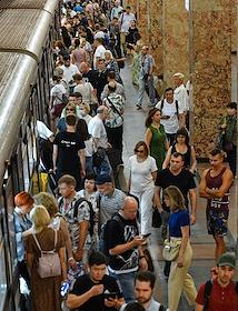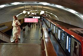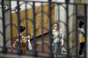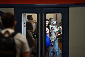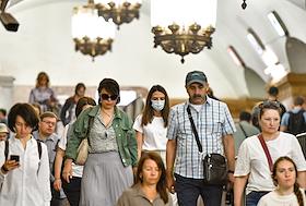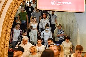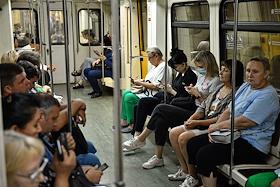 Виды Москвы в период подъема заболеваемости коронавирусной инфекцией. Жанровая фотография. Ситуация в московском метрополитене. Пассажиры на станции метро.