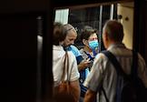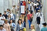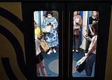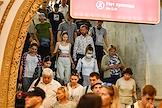 Виды Москвы в период подъема заболеваемости коронавирусной инфекцией. Жанровая фотография. Ситуация в московском метрополитене. Пассажиры на станции "Киевская" Кольцевой линии метро.