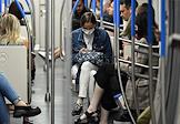 Виды Москвы в период подъема заболеваемости коронавирусной инфекцией. Жанровая фотография. Ситуация в московском метрополитене. Пассажирка в медицинской маске и перчатка в вагоне поезда.