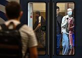 Виды Москвы в период подъема заболеваемости коронавирусной инфекцией. Жанровая фотография. Ситуация в московском метрополитене. Пассажиры в медицинских масках на станции "Комсомольская" Сокольнической линии метро.