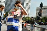Виды Москвы в период подъема заболеваемости коронавирусной инфекцией. Жанровая фотография. Девушка в медицинской маске на Калужской площади.
