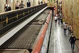 Виды Москвы в период подъема заболеваемости коронавирусной инфекцией. Жанровая фотография. Ситуация в московском метрополитене. Пассажиры в медицинских масках на станции "Александровский сад" Филевской линии метро.