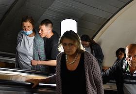 Виды Москвы в период подъема заболеваемости коронавирусной инфекцией. Жанровая фотография. Ситуация в московском метрополитене. Пассажиры в медицинских масках на эскалаторе в метро.