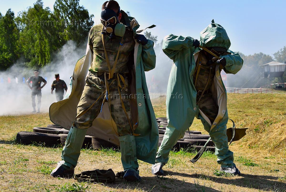 Международный военно-технический форум "Армия-2022". Международные армейские игры. Конкурс "Страж порядка", этап "Гонка патрульного наряда". Динамический показ маневренных действий межвидовой группировки войск на военном полигоне Алабино. Участники команды военнослужащих России во время прохождения полосы препятствия в костюме химической защиты.