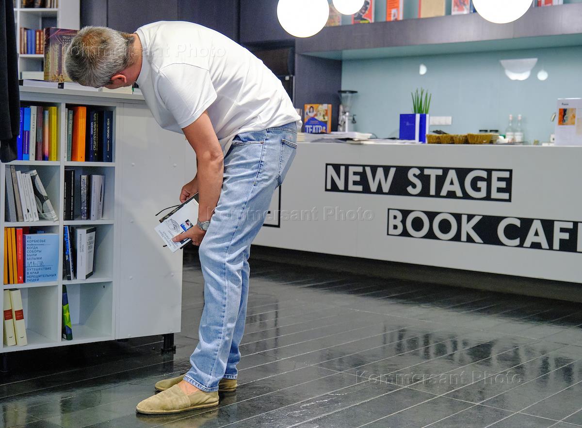 Пресс-конференция, посвященная гастролям Театра на Бронной в Санкт-Петербурге. Художественный руководитель театра "На Малой Бронной", режиссер Константин Богомолов в книжном магазине перед началом пресс-конференции.