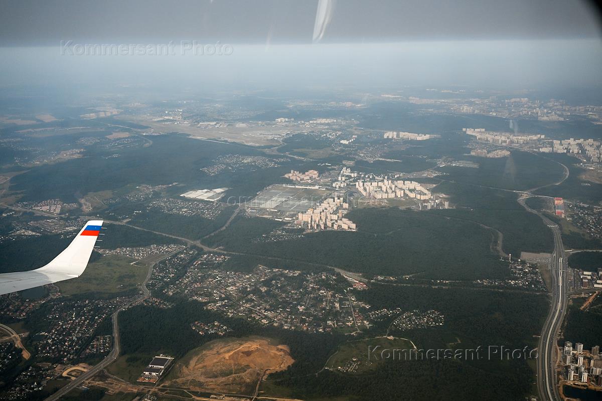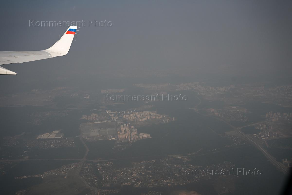 Виды Москвы. Дым и смог от природных лесных пожаров в Рязанской области в районе Международного аэропорта Внуково.