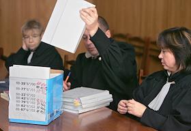 Судья Арбитражного суда Москвы Павел Марков (в центре) во время заседания, на котором рассматривалось дело о банкротстве нефтяной компании (НК) "ЮКОСа".