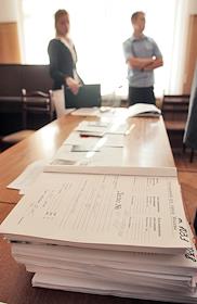 Заседание Арбитражного суда Москвы, на котором рассматривалось дело о банкротстве нефтяной компании (НК) "ЮКОСа". Мужчина читает книгу с законом о несостоятельности (банкротстве) в зале суда.