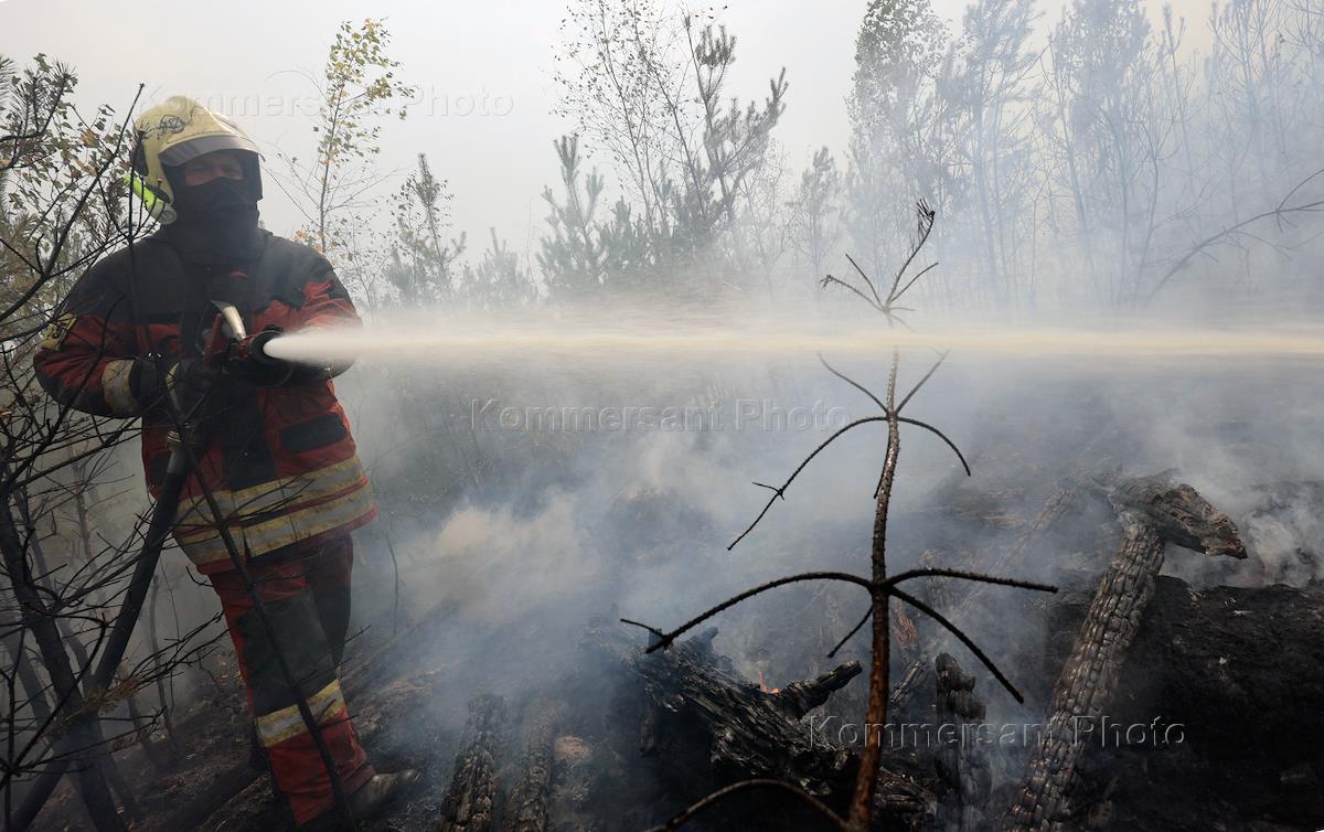 Extinguishing forest fires in the Ryazan region. Genre photography.